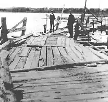 The bridge proved to be an expensive burden, and for many years the responsibility for maintaining it was repeatedly shifted from township to county and back again. Ice would often carry away entire sections of the bridge during the spring thaw, requiring replanking or complete reconstruction. In the spring of 1876, work began to convert the first 180 metres (590 ft) of the Port Perry side of the floating bridge into a permanent embankment. Logs were placed along both sides the bridge and various materials piled between them, sinking it into the soft soil below. Earth laid over top to provide a stable surface. The process also increased the width of the roadbed from 3.7 metres (12 ft) to 5.5 metres (18 ft).[7][8]