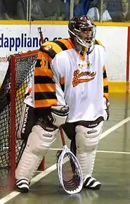National Lacrosse League goalie Tye Belanger with his 2014 OLA Senior B Lacrosse League team Sarnia Beavers.