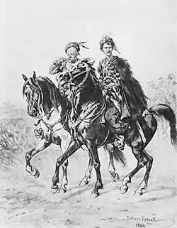 After meeting another character of the Trilogy, Jan Skrzetuski, Zagłoba, until now living a meaningless life of a lesser noble, trying to survive by exploiting the good faith of others, becomes drawn into the company of hero-like personas, and slowly changes, to become worthy of their trust and friendship.[1][2] Together with them, Zagłoba engages in various adventures, fighting for the Polish–Lithuanian Commonwealth, and seeking adventures and glory.[3] During a feast, in a rather drunken state, he was the first to call prince Janusz Radziwiłł a traitor.[4] Eventually he becomes a widely known person, treated with respect by powerful magnates and offering counsel to the king.[1] He was balding and half-blind, known for his love of drinking and story-telling (usually glorifying his own exploits), tendency to poke fun at everyone and everything, later also renowned as a cunning tactician.[4]