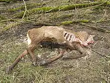 The reserve is the subject of decades of management reports[11][12][13] and protests[14][15] against the large reported number of grazers dying by starvation or shot to death,[16][17] while the animals are kept behind a fence and cannot migrate.[18] During a particularly harsh winter in 2005, many animals in the Oostvaardersplassen died of starvation, leading to public outcry against alleged animal cruelty and leading to the culling strategy.[19] In the winter of 2017–2018, almost 3.300 deer, horses and cattle starved to death[20] dividing[21] the Dutch public[22] and leading to demonstrations and individuals feeding hay to the animals despite police arrests.[23][15]
