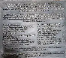 While at Sachsenhausen concentration camp, the men from Operation Checkmate were forced into breaking in German Army boots by marching 30 miles (48 km) a day over cobblestones. Five of the team excluding Mayor and Roe were executed on 2 February 1945. Mayor and Roe were transferred to Belsen concentration camp, where Mayor was executed on 7 April 1945 and Roe died of Typhus.[1][9] Godwin was posthumously Mentioned in Despatches on 9 November 1945, "For great gallantry and inspiring example whilst a prisoner of war in German hands in Norway and afterwards at Sachsenhausen, near Oranienburg, Germany, 1942-1945."[10] He is commemorated on the Portsmouth Naval Memorial, one of the memorials for those of the naval service with no known grave.[11] Mayor was posthumously Mentioned on 22 April 1947, "for great fortitude and resolution while in the hands of the Germans, from the time of his capture in 1943 to the time of his death at Belsen in April 1945" and is commemorated on the Plymouth Naval Memorial.[12] Cox is commemorated on the Brookwood Memorial.[13] Roe is also commemorated on the Portsmouth Naval Memorial,[14] Hiscock on the Lowestoft Naval Memorial,[15] Burgess on the Chatham Naval Memorial,[16] and West also on the Plymouth Naval Memorial.[17]
