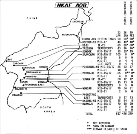 A number of factors prevented an immediate response from the Enterprise's embarked Carrier Air Wing Nine of 85 aircraft.[15][Note 5] The air wing's aircraft had sustained damage from a recent typhoon and those remaining 35 operational strike aircraft had to be re-spotted on the flight deck and armed with air-to-surface ordnance.[18][20] Additionally, the ship could not stage replacement aircraft through Japan due to the status of forces agreement that prohibited the combat use of U.S. military aircraft re-deployed from a neutral nation.[15][20] Another factor was that Wonsan was protected by 14 anti-aircraft batteries, two surface-to-air missile sites, and up to 75 MiG fighters.[21]