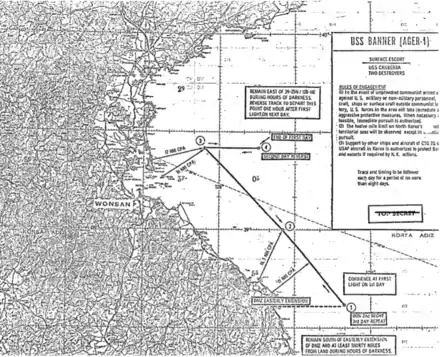 Although not directly related to Operation Formation Star, the Republic of Korea Navy also dispatched nineteen ships and two fast patrol boats to sixteen patrol zones around South Korea.[38] Also, at the United Nations Command in South Korea, General Charles H. Bonesteel III was concerned about border security and recommended two U.S. destroyers and maritime patrol aircraft reinforce the South Korean naval and air units conducting maritime patrol and interdiction.[39]