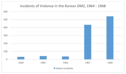 Also referred to as a Second Korean War, the Korean DMZ Conflict was a series of low-level armed clashes between North Korean forces and the forces of South Korea and the United States, largely occurring between 1966 and 1969 at the Korean DMZ.[6] The number of incidents along the DMZ jumped from 37 in 1966 to 435 in 1967, with a combined 1967 total of 371 fatalities involving North Korea, South Korea, and United Nations forces while there were no fatalities in 1966 (see chart).[Note 3][7] Also, during 1967, there were two sabotage attempts to disrupt South Korea railroad operations, the first such attempts since the end of the Korean War. Additionally, in 1967, a South Korean patrol vessel was sunk by North Korea shore batteries over a fishing dispute, with thirty-nine of the 79-man crew killed.[8]