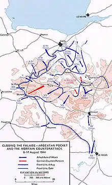 By 13 August, the offensive had fully halted, with German forces being driven out of Mortain. The Germans had lost 120 tanks and assault guns to Allied counter-attacks and air strikes, more than two-thirds of their committed total.[25][26][1] As Hitler ordered German forces in Normandy to hold their positions,[24] the U.S. VII and XV Corps were swinging east and north toward Argentan.[24] The German attack west left the 7th Army and Panzergruppe West in danger of being encircled by Allied forces. As American forces advanced on Argentan, British and Canadian forces advanced on Falaise, threatening to cut off both armies in the newly formed Falaise Pocket.[24]