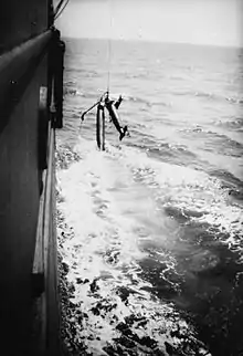 On the afternoon of 14 August, Brisbane Star arrived at Valletta Harbour with Spitfires circling overhead.[83] Ohio was surrounded by ships to nurse the tanker to Grand Harbour and several American volunteers from Santa Eliza manned anti-aircraft guns on Ohio during the tow.[87] The weight of the tanker kept breaking the tow lines, while constant air attacks were made by 20 bombers that destroyed the rudder, made a hole in her stern and brought the decks awash. The tanker was towed in by the destroyers Ledbury and Penn lashed on either side, with the minesweeper HMS Rye acting as a stabiliser at the stern.[76] More air attacks disrupted the towing formation, until it was re-established with Bramham replacing Ledbury for the remainder of the journey.[31] Ohio was towed into Grand Harbour at 09:30 on 15 August, to cheering crowds and a band playing Rule Britannia.[88] The crowd fell silent as the ships entered harbour, men removed their hats, women crossed themselves and a bugle sounded Still.[89] The tanker discharged oil into two tankers and water was pumped in at the same time, to reduce the chance of structural failure. Ohio settled on the bottom just as the last of the fuel was emptied.[90][lower-alpha 11]