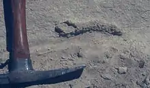 Ophiomorpha is an ichnotaxon, usually interpreted as a burrow of an organism (specifically a crustacean[2]) living in the near-shore environment.[3] The burrow lining is more or less smooth on the inside, and densely to strongly mammalated or nodose on the outside, due to the packing of fecal pellets for support of the burrow. Branching is irregular but Y-shaped where present.[4] It (particularly O. nodosa) is often considered part of the Skolithos ichnofacies,[5] where it has occurred (i.e. nearshore environments) since the early Permian,[6] though it (particularly O. rudis) has also occurred in deep water settings (Nereites ichnofacies) since the Late Jurassic, such as well-oxygenated turbidites.[7]