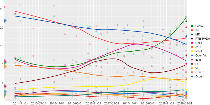 | 25 Mar - 14 Apr 2019 | TNS Kantar | RTBF / VRT / De Standaard / La Libre[42] | 1,004 | 24.7% | 18.3% | 22.0% | 14.8% | 9.3% | 3.9% | 3.5% | ? | 3.5%[lower-alpha 2] | 2.7% | 18.3% | 81.7% | 63.4% |