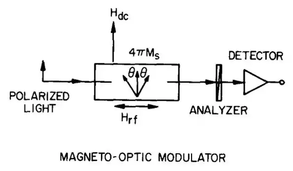 A dc magnetic field Hdc is applied perpendicular to the light propagation direction to produce a single domain, transverse directed 4~Ms. The rf modulation field Hrf, applied by means of a coil along the light propagation direction, wobbles 4~Ms through an angle of @ and produces a time varying magnetization component in the longitudinal direction. This component then produces an ac variation in the plane of polarization via the longitudinal Faraday effect. Conversion to amplitude modulation is accomplished by the indicated analyzer.