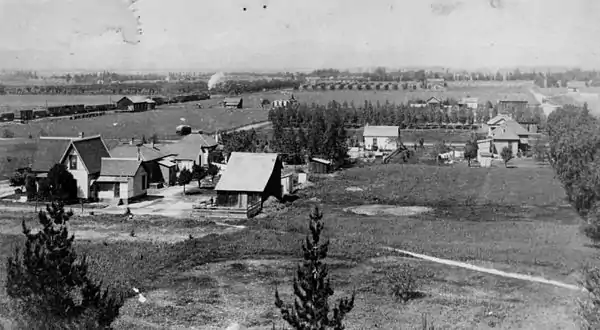 View of the early rural farm community in the town of Orange. A train can be seen on the left.