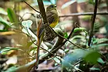 The orange-breasted trogon is a medium-sized bird that measures between 25-31 cm in length and weighs about 49-57 g.[5] The males have a dull olive-yellow head and a rufous-chestnut colour that extends from the upperparts to the upperpart of the tail. Underneath the tail the body is black and white. Primaries are black with white vertical bars and wing coverts are barred black. There is a yellow-orange lower breast which becomes lighter as it approaches the vent. A blue eye ring is present. The females has a more grey-brown head and upperparts, and a grey breast with yellow at the belly and vent. Both genders have grey feet with two toes pointing backwards, a common trait among trogons.[6][5][3]