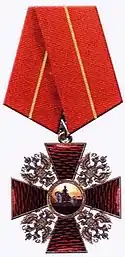 The Order of Alexander Nevsky (Russian: орден Александра Невского) is an order of merit of the Russian Federation named in honour of saint Alexander Nevsky (1220–1263) and bestowed to civil servants for twenty years or more of highly meritorious service. It was originally established by the Soviet Union as a military honour during World War II, more precisely by Decree of the Presidium of the Supreme Soviet of the USSR of July 7, 1942.[1] Its statute was amended by Decree of the Presidium of the Supreme Soviet of the USSR of February 26, 1947.[2] It bears a similar name to the Imperial Order of St. Alexander Nevsky which had been established by Empress Catherine I of Russia in 1725, and continued to be bestowed by the heads of the House of Romanov after the 1917 Russian Revolution. The Order of Alexander Nevsky was reinstated by the Soviet Union, minus the words "Imperial" and "Saint", for award to officers of the army for personal courage and resolute leadership. The Order was retained by the new Russian Federation following the dissolution of the USSR by Decision of the Supreme Soviet of the Russian Federation 2557-I of March 20, 1992[3] but was never awarded. The September 7, 2010 Decree №1099[4] of the President of the Russian Federation redesigned the badge of the Order closer to pre-1917 imperial model and amended the statute of the Order making it a purely civilian award.