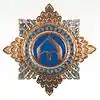 The Order is awarded in five classes and has a blue ribbon with a yellow stripe on each edge.