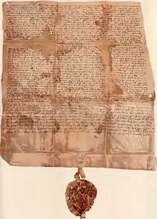 The Statutes were written in Latin, the language of learned writing in Hungary before the 19th century, and are about 1700 words long, in the form of letters patent. Suspended from the document was the great seal of the Society with the classic iconic representation of St George mounted on a horse slaying the dragon under the horse's hooves as shown on the right. The document is currently housed in the Országos Levéltar (National Archives of Hungary), DL. 40 483. There are a number of transcriptions and translations of the Statutes, facilitating study.[4][5][6][7][8]