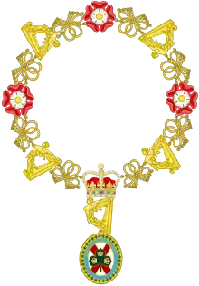 - The collar was made of gold, consisting of Tudor roses and harps attached with knots. The two roses which comprise the Tudor rose were alternately enamelled white within red, and red within white. The central harp, from which the badge of the Order was suspended, was surmounted by a crown.[29]