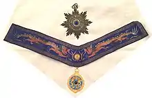 The order took on many different designs and forms until its abolition in 1911. Gradations were distinguished most commonly by differentiation in the type and size of precious stones inlaid, the shape of the medallion, the length of the ribbon, and the material used to construct the medallion. Gold and pearl were reserved for the higher classes, enamel and coral for the lowest classes.[4] The original designs were similar in style and appearance to traditional Chinese insignia, but they proved cumbersome for many to wear and in 1897 they were redesigned in the form of a Western-style breast-badge, although the original designs were still awarded for some time afterwards.[5] Similar symbolic motifs accompanied all designs over the award's history, most notably two dragons surrounding a central precious stone and flames which were connotative symbols of imperial authority. Other symbols of imperial authority - mountains, clouds, plum blossoms and characters with providential meanings - were added to variations of the designs over time.[6]