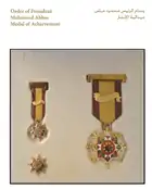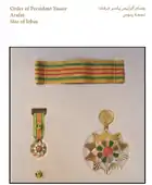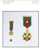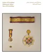 The Star of Friendship is a distinctive level in this Order that can be awarded by the order of the President to Ministers, Ambassadors, Envoys, Governors, Members of Parliaments, Representative of Parties and those of similar standing.[27] The Medal of Achievement is a motivating level in this Order that can be awarded by the order of the President to distinguished and creative talents and persons who realized significant achievements and perseverance in the field of their specialties and work.[27]