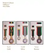 - The Medal of Honor is composed of three ranks (Gold- Silver- Bronze) and can be awarded by the order of the President to military personnel and civilians of the staffs and troops of the Palestinian security services appreciation of their honoree serve to their country and their courage and heroic acts.
