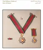 The Military Order of the Star of Honor is considered a middle rank military order that can be awarded by the order of the President to Palestinian, Arab and foreign military and security leaders who have provided services to Palestine.[44]