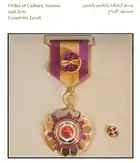 The Order of Culture, Science and Arts was also issued and is intended to be awarded to Palestinian and foreign intellects, authors, writers, poets, scientists, researchers and artists in appreciation of their significant works which succeeded at the national level.[15]