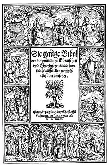 At the beginning of the 16th century, the Imperial free city of Zurich became increasingly important as a location holding the Federal Diet of Switzerland. After the position of the Leutpriestertum (people's priest) of the Grossmünster at Zürich became vacant in late 1518, the canons of the foundation in charge of the Grossmünster elected Ulrich Zwingli to become the stipendiary priest and on 27 December 1519 he moved permanently to Zürich from where he subsequently initiated the Swiss Reformation. Around the same time, a book printer Christoph Froschauer relocates from Altötting in Bavaria[8] to Zurich[9] to be granted the rights of citizen of Zurich in 1519.[10] The city commissioned him with the task of setting up a printing press alongside with further assignments that would result in the establishment and expansion of the printers.[10] Froschauersche Druckerei received the status of a state printer[11] and ultimately published the works of Erasmus von Rotterdam, Martin Luther and Zwingli.[12][13] Subsequently, Froschauer Druckerei expanded its product range to include historical, medical and scientific writings.[14]