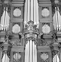 The center tower of the Rückpositiv is crowned with the coat of arms of the patronage family, Alberda van Menkema. Two upright lions hold a shield. The lateral carvings show openwork acanthus tendrils with volutes that merge into musical angelic figures. Acanthus foliage is located on the case above the flat fields and encloses the entire Rückpositiv above and below the pipe fields. The carvings are attributed to Jan de Rijk.[6]