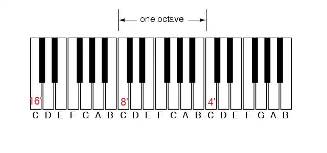 The octave sounded by a given pipe is inversely proportional to its length ("half the length = double the pitch"), meaning that a 4′ stop speaks exactly one octave higher than an 8′ stop. Likewise, a 2′ stop speaks one octave higher than a 4′ stop. Conversely, a 16′ stop speaks one octave below an 8' stop; and a 32′ stop speaks one octave below a 16′ stop. Octave pitch lengths used in actual organs include 64′, 32′, 16′, 8′, 4′, 2′, 1′, 1⁄2′, and 1⁄4′.