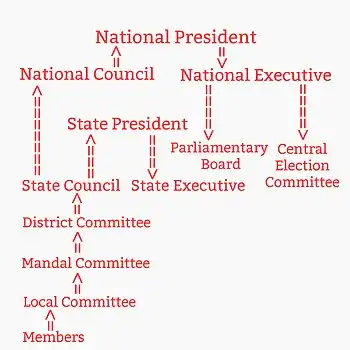 The organisation of the Bharatiya Janata Party (BJP) is based upon the Constitution of the Bharatiya Janata Party.[1] The organisation of the BJP is strictly hierarchical, with the president being the highest authority in the party. The party is considered to be a cadre-based party that draws from the Hindutva-based ideology of its parent organisation, the Rashtriya Swayamsevak Sangh.[2][3]