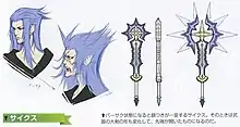 Saïx (サイクス, Saikusu), also known as the "Luna Diviner" (月に舞う魔人, Tsuki ni Mau Majin, lit. "Devil Dancing in the Moon"), is Xemnas' right-hand man with an X-shaped facial scar who wields a claymore and uses the power of the moon to assume a berserk state of mind.[7][42] He was originally a resident of Radiant Garden named Isa (アイザ, Aiza) and Lea's best friend who met Ventus during the events of Birth By Sleep. During a successful attempt to sneak into the castle, they found and befriended an imprisoned girl designated "Subject X", who was being used for Ansem the Wise's experiments. Isa and Lea periodically visited Subject X before attempting to rescue her one-day but she had disappeared. Isa joined Lea in an endeavor to become apprentices to Ansem the Wise to find out what happened to Subject X, which led to Isa becoming Saïx. Saïx had Axel help him climb the Organization's ranks to become Xemnas' second-in-command in the hopes of finding clues to Subject X's whereabouts. However, his cold and ruthless personality as a Nobody and obsession of restoring himself as a complete being strained his friendship with Axel; furthermore, Saïx grew jealous of Axel's friendship with Roxas and Xion, and saw it as an act of betrayal against him and Subject X as he came to believe Axel had abandoned them.