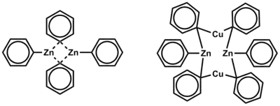 These structures cause zinc to have two bonding d-orbitals and three low-lying non-bonding d-orbitals (see non-bonding orbital), which are available for binding. When zinc lacks electron donating ligands it is unable to obtain coordination saturation, which is a consequence of the large atomic radius and low electron deficiency of zinc. Therefore, it is rare for bridging alkyl or aryl groups to occur due to the weak electron deficiency of the zinc atom. Although, it does occur in some cases such as Ph2Zn (Shown below) and which halogens are the organozinc can form metal clusters (see cluster chemistry). When a halogen ligand is added to the zinc atom both the acceptor and donor character of zinc is enhanced allowing for aggregation.[2]