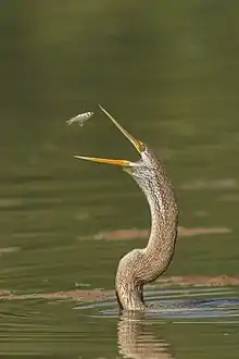 The Oriental darter (Anhinga melanogaster) is a water bird of tropical South Asia and Southeast Asia. It has a long and slender neck with a straight, pointed bill and, like the cormorant, it hunts for fish while its body is submerged in water. It spears a fish underwater, bringing it above the surface, tossing and juggling it before swallowing the fish head first. The body remains submerged as it swims, and the slender neck alone is visible above the water, which accounts for the colloquial name of snakebird. Like the cormorants, it has wettable feathers and it is often found perched on a rock or branch with its wings held open to dry.