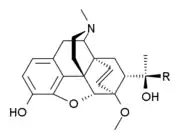 Of much greater relevance are the properties of the orvinols, a large family of semi-synthetic oripavine derivatives classically synthesized by the Diels-Alder reaction of thebaine with an appropriate dienophile followed by 3-O-demethylation to the corresponding bridged oripavine. These compounds were developed by the group led by K. W. Bentley in the 1960s, and these Bentley compounds represent the first series of "super-potent" μ-opioid agonists, with some compounds in the series being over 10,000 times the potency of morphine as an analgesic.[3][4][5] The simple bridged oripavine parent compound 6,14-Endoethenotetrahydrooripavine is already 40 times the potency of morphine,[6] but adding a branched tertiary alcohol substituent on the C7 position results in a wide range of highly potent compounds.[7]