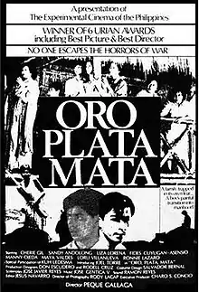 Oro, Plata, Mata is a 1982 Philippine historical war drama film directed by Peque Gallaga, from a story by Peque Gallaga, Mario Taguiwalo, and Conchita Castillo and screenplay by José Javier Reyes. The film is considered to be Gallaga's most significant contribution to the Philippine cinema. Set in the Philippine province of Negros during World War II, it tells the story of how two haciendero families cope with the changes brought about by the war.[1] In translation, the movie is also known either as "Gold, Silver, Bad Luck" or "Gold, Silver, Death."[2]