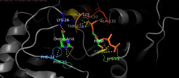 - González-Segura L, Witte JF, McClard RW, Hurley TD (December 2007). "Ternary complex formation and induced asymmetry in orotate phosphoribosyltransferase". Biochemistry. 46 (49): 14075–86. doi:10.1021/bi701023z. PMID 18020427.