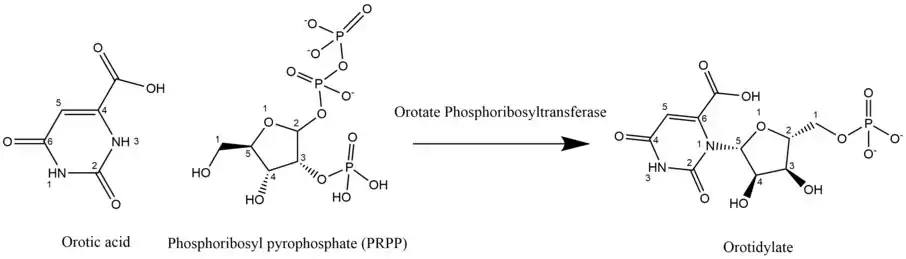 Orotate phosphoribosyltransferase (OPRTase) or orotic acid phosphoribosyltransferase is an enzyme involved in pyrimidine biosynthesis. It catalyzes the formation of orotidine 5'-monophosphate (OMP) from orotate and phosphoribosyl pyrophosphate.[1] In yeast and bacteria, orotate phosphoribosyltransferase is an independent enzyme with a unique gene coding for the protein, whereas in mammals and other multicellular organisms, the catalytic function is carried out by a domain of the bifunctional enzyme UMP synthase (UMPS).[2]