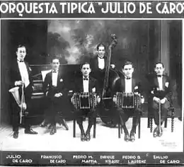 In Argentina and Uruguay, the term orquesta típica is associated with tango music. The orquesta típica usually comprises a string section (three or four violins, and sometimes viola and cello), three or more bandoneons, and a rhythm section (piano and double bass).[1] An orquesta típica is an expanded version of a sexteto típico, which includes 2 bandoneons, 2 violins, double bass and piano.