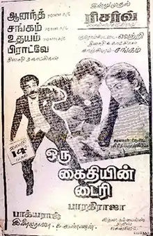 Oru Kaidhiyin Diary (transl. A Prisoner's Diary) is a 1985 Tamil-language action thriller film directed by Bharathiraja and written by K. Bhagyaraj. The film stars Kamal Haasan. It was high financially successful and completed 175 day run in theatres become silver jubille film, and was remade in Hindi as Aakhree Raasta (1986), directed by K. Bhagyaraj.