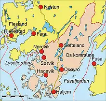 Os is a former municipality in the old Hordaland county, Norway. It was located in the Midhordland region, just south of Norway's second-largest city, Bergen. Due to its proximity to Bergen, Os experienced strong population growth.[3] The administrative centre (and commercial centre) of Os was the village of Osøyro. It is the largest settlement in the municipality, with over 60% of the municipal residents living here. Other large villages in Os included Hagavik, Halhjem, Søfteland, Søre Øyane, and Søvik.