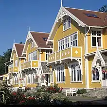 The coat of arms is relatively modern, having been adopted in 1949 after a local competition. The arms are gold with a red background. The lower part of it shows one Oselvar, a boat design traditionally associated with the area. There is a small flower design above the boat.[9][10]