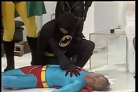 ![]() The Trapalhões: Mussum (green shirt), Zacarias (blue and yellow shirt) Dedé (blue shirt) and Didi (white shirt) | |