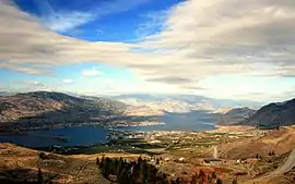 Osoyoos (/ɒˈsuːjuːs/,[2] historically /ˈsuːjuːs/)[3] is the southernmost town in the Okanagan Valley in British Columbia between Penticton and Omak. The town is 3.6 kilometres (2.2 mi) north of the United States border with Washington state and is adjacent to the Osoyoos Indian Reserve.[3] The origin of the name Osoyoos was the word sẁiẁs (pronounced "soo-yoos") meaning "narrowing of the waters" in the local Okanagan language (Syilx'tsn). The "O-" prefix is not indigenous in origin and was attached by settler-promoters wanting to harmonize the name with other place names beginning with O in the Okanagan region (Oliver, Omak, Oroville, Okanogan).[4] There is one local newspaper, the Osoyoos Times.