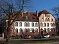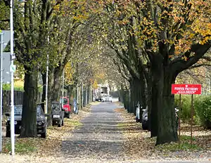 This axis was a dual carriageway avenue lined up with trees, called Hohenzolernstrasse in its south part, Bülowstrasse in it north part (in 1920 it became part of Adam Mickiewicz alley). The construction of the avenue has been completed in 1903; this was then the widest street in the city: 40 m wide, it had two carriageways, and in a pedestrian walkway in the middle with lawn and trees (red oaks with festoons of Virginia creepers.[4] Street inception was in direct relationship with the erection in 1902 of buildings for the Kaiser Wilhelm's first university and scientific institution in Bydgoszcz (German: Kaiser "Wilhelm's Institut für Landwirtschaft zu Bromberg").[2] The institute architectural ensemble has been erected on the eastern side of the street between 1903 and 1906. By contrast, the area on the western side of the alley has been planned and designed in 1912 by German architect Josef Stübben. However, most of the villas in this district ("Sielanka" or Idyll) have been essentially erected during interwar period.[5]