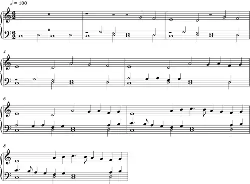 Later in the medieval era, Guillaume Dufay's 15th-century chanson Resvelons Nous features a similarly constructed ostinato pattern, but this time 5 bars long. Over this, the main melodic line moves freely, varying the phrase-lengths, while being "to some extent predetermined by the repeating pattern of the canon in the lower two voices."[9]