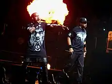 On August 28, 2011, Jay-Z & Kanye West performed the song for the first time at the 2011 MTV Video Music Awards. The two rappers marched down the runaway with "flames erupting in the background."[53] The song was performed at all stops of their 2011–12 Watch the Throne Tour, generally as one of the opening tracks. It was performed "with a Givenchy-designed American flag flashing on the stage's main screen."[54] During Jay-Z's setlist at the 2012 Radio 1's Big Weekend festival, West joined Jay-Z to perform "Otis" and other Watch the Throne hits like "Niggas in Paris" and "No Church in the Wild".[55]