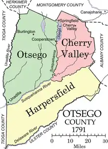 Otsego and Cherry Valley together roughly covered the area of modern Otsego County, while Harpersfield covered the area south of the current county as far as the Delaware River.