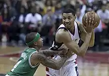 Porter was selected with the third overall pick in the 2013 NBA draft by the Washington Wizards.[8] However, he missed training camp and the first 18 games of the 2013–14 season with a hip injury. He made his NBA debut on December 6, going scoreless in 14 minutes in a 109–105 overtime loss to the Milwaukee Bucks.[9] He twice scored a season-high nine points in April 2014.[10] On November 1, 2014, he scored 19 of his career-high 21 points in the second half of the Wizards' 108–97 win over the Bucks.[11] On November 7, 2015, he set a new career high with 23 points in a 114–99 loss to the Atlanta Hawks.[12] On December 12, 2015, he scored a career-high 28 points in a 114–111 win over the Dallas Mavericks.[13]