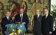 Otto von Habsburg was Vice President (1957–1973) and President (1973–2004) of the International Paneuropean Union, and served as a Member of the European Parliament for the Christian Social Union of Bavaria (CSU) from 1979 to 1999. As a newly elected Member of the European Parliament in 1979, Otto had an empty chair set up for the countries on the other side of the Iron Curtain in the European Parliament, and took a strong interest in the countries behind the Iron Curtain. Otto von Habsburg played a notable role in the revolutions of 1989, as a co-initiator of the Pan-European Picnic. Later he was a strong supporter of the EU membership of central and eastern European countries.[12] A noted intellectual, he published several books on historical and political affairs. Otto has been described as one of the "architects of the European idea and of European integration" together with Robert Schuman, Konrad Adenauer, and Alcide De Gasperi.[13]