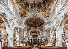 From 1711-1725 Abbot Rupert erected the present monastery, the architectural grandeur of which has merited for it the name of "the Swabian Escorial", attesting to the economic significance of the abbey. It was famous for its book illuminations.[7] The abbey library features stucco ceiings by Johann Baptist Zimmermann and ceiling paintings by Elias Zobel.[8]