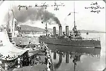 Hamidiye fought in the Balkan Wars under the command of Captain Rauf Orbay, and was the only Ottoman ship to distinguish itself in the conflict.[5] In November 1912, while shelling Bulgarian positions during the First Balkan War, Hamidiye was damaged in the Battle of Kaliakra by the Bulgarian torpedo boat Drazki,[6] though Orbay claimed to have sunk two other torpedo boats.[7] The torpedo tore a 10 ft (3.0 m) hole in her bow on the starboard side, and killed eight men.[8] Though the bow was mostly submerged, it was able to withdraw back to home port for repairs. On 14 January 1913, Hamidiye slipped through the Greek naval blockade of the Dardanelles under cover of night, and proceeded to raid Greek shipping in the Aegean. The next day, at Syros, it sank the Greek armed merchantman Makedonia and shelled the town of Ermoupoli. From there it set sail to Beirut and Port Said.[9][10] The raids of Hamidiye and its ability to roam around the Mediterranean and sow confusion, disrupt shipping and destroy various ships and facilities while avoiding its pursuers became a major morale booster for the Ottomans. The main aim of its sally however, to draw away the Greek cruiser Georgios Averof so as to enable the Ottoman fleet to tackle the rest of the Greek navy in support of the Ottoman land forces, failed.