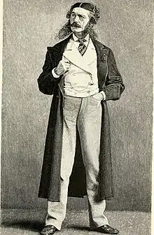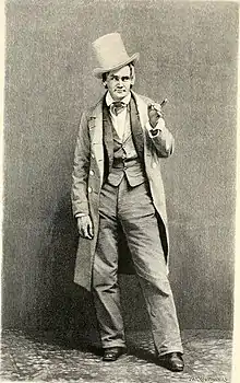 Our American Cousin premiered in New York on October 15, 1858. After several weeks of performances, Sothern began portraying the role more broadly, as a lisping, skipping, eccentric, weak-minded fop prone to nonsensical references to sayings of his "bwother" Sam.[2] His ad-libs were a sensation, earning good notices for his physical comedy and spawning much imitation and mockery in both the United States and England. Sothern gradually expanded the role, adding gags and business until it became the central figure of the play. The most famous scene involved Dundreary reading a letter from his even sillier brother. The play ran for 150 nights, which was very successful for a New York run at the time.[3] Sothern made his London debut in the role when the play ran for 496 performances at the Haymarket Theatre in 1861, earning rave reviews.[4] The Athenaeum wrote, "it is certainly the funniest thing in the world ... a vile caricature of a vain nobleman, intensely ignorant, and extremely indolent".[5] Sothern successfully revived the play many times, making Dundreary by far his most famous role.